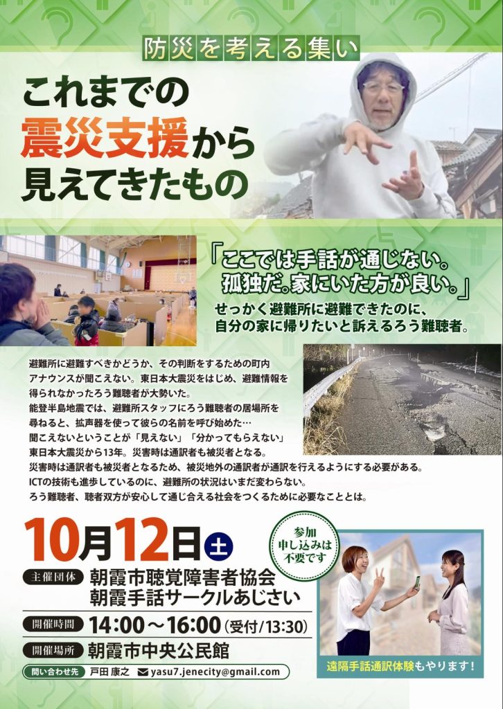 新座市聴覚障害者協会より情報提供です。ご興味のある方は、ぜひご参加ください。 ● これまでの震災支援から見えてきたもの 日時:2024年10月12日(土) 14:00~16:00(受付開始 13:30)場所:朝霞市中央公民館 ※詳しくはチラシをご覧ください。 朝霞市防... -