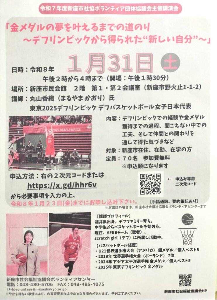 新座手話サークルより情報提供です。 ● 東京2025デフリンピック デフバスケットボール女子日本代表 丸山香織氏の講演会 2026年1月31日(土) 新座市社協主催の講演会があります。 詳しくはチラシをご覧ください。 -